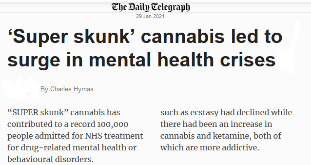 In January 2021, the Daily Telegraph published an article headlined “’Super skunk’ cannabis led to surge in mental health crisis”. This old trope, that cannabis causes mental illness, is now confined almost exclusively to our corner of North-West Europe. The Irish also suffer under this myth and to a lesser extent, so do Australia and New Zealand but everywhere else in the world a far more balanced and realistic view is taken.