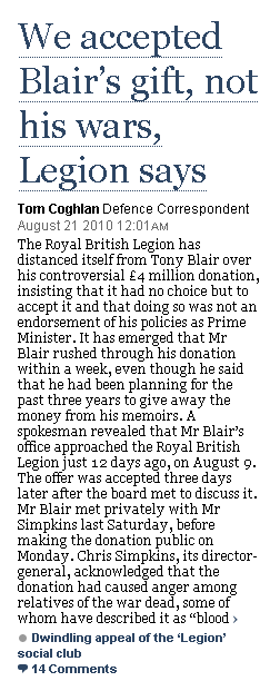 Chris Simpkins, the Royal British Legion’s director-general is an ungrateful, ill-mannered oaf. All he had to do was keep his mouth shut. He has dishonoured the generous intent behind Blair’s donation and he should be ashamed of himself. The Times also needs to have its motives examined for running this shabby, despicable story.