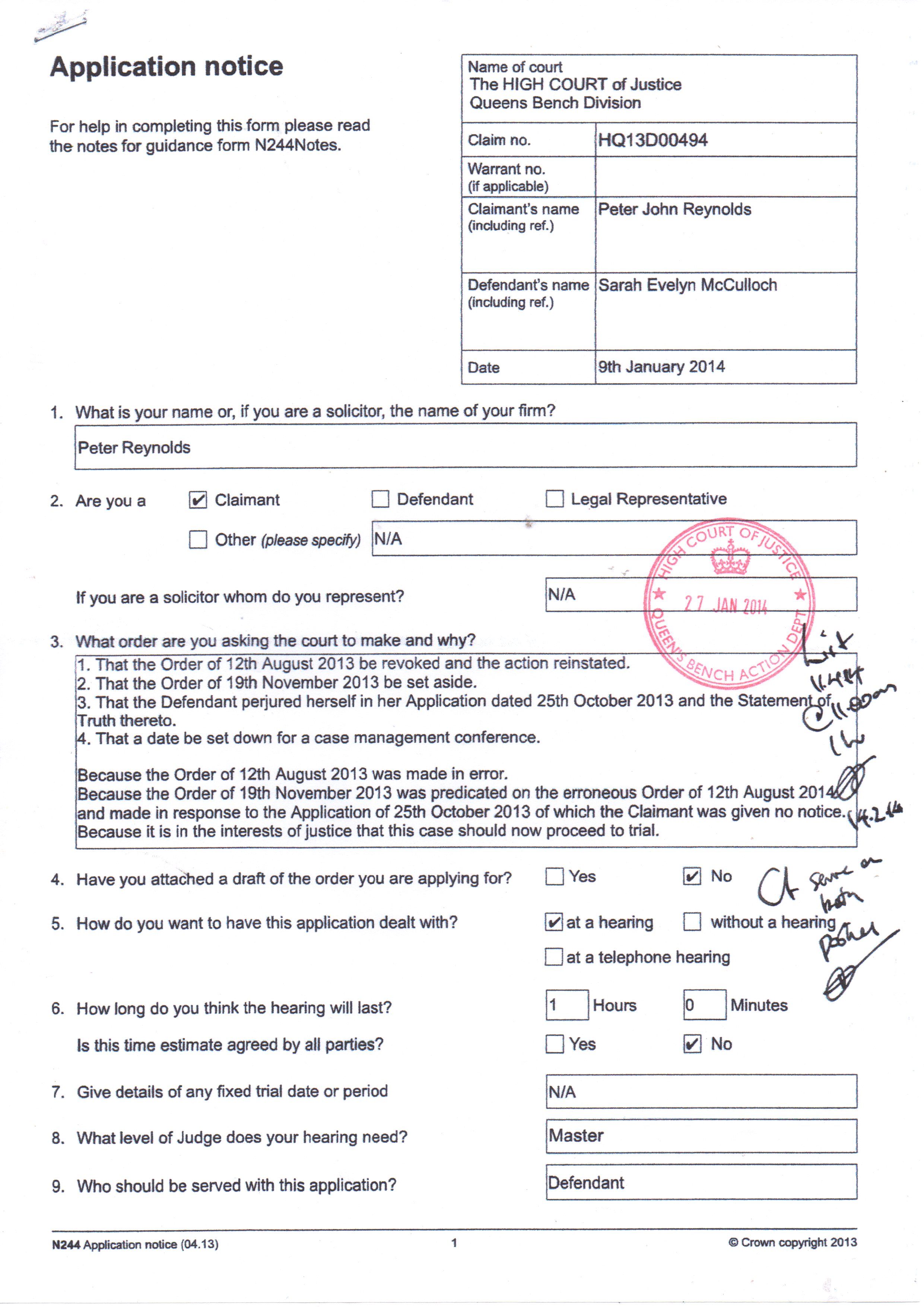 In October last year Sarah McCulloch submitted an application to the High Court seeking judgement against me on the grounds that I had “not acted on my claim”. This was untrue. Also, in a bizarre twist she revealed that she has twice reported me to the police for harassment for sending her correspondence about the case! These positions are clearly incompatible with each other. Dishonestly, she submitted her application and attended a hearing on 19th November 2014 without ever notifying me. She has now admitted this in writing saying that it was a “mistake”.