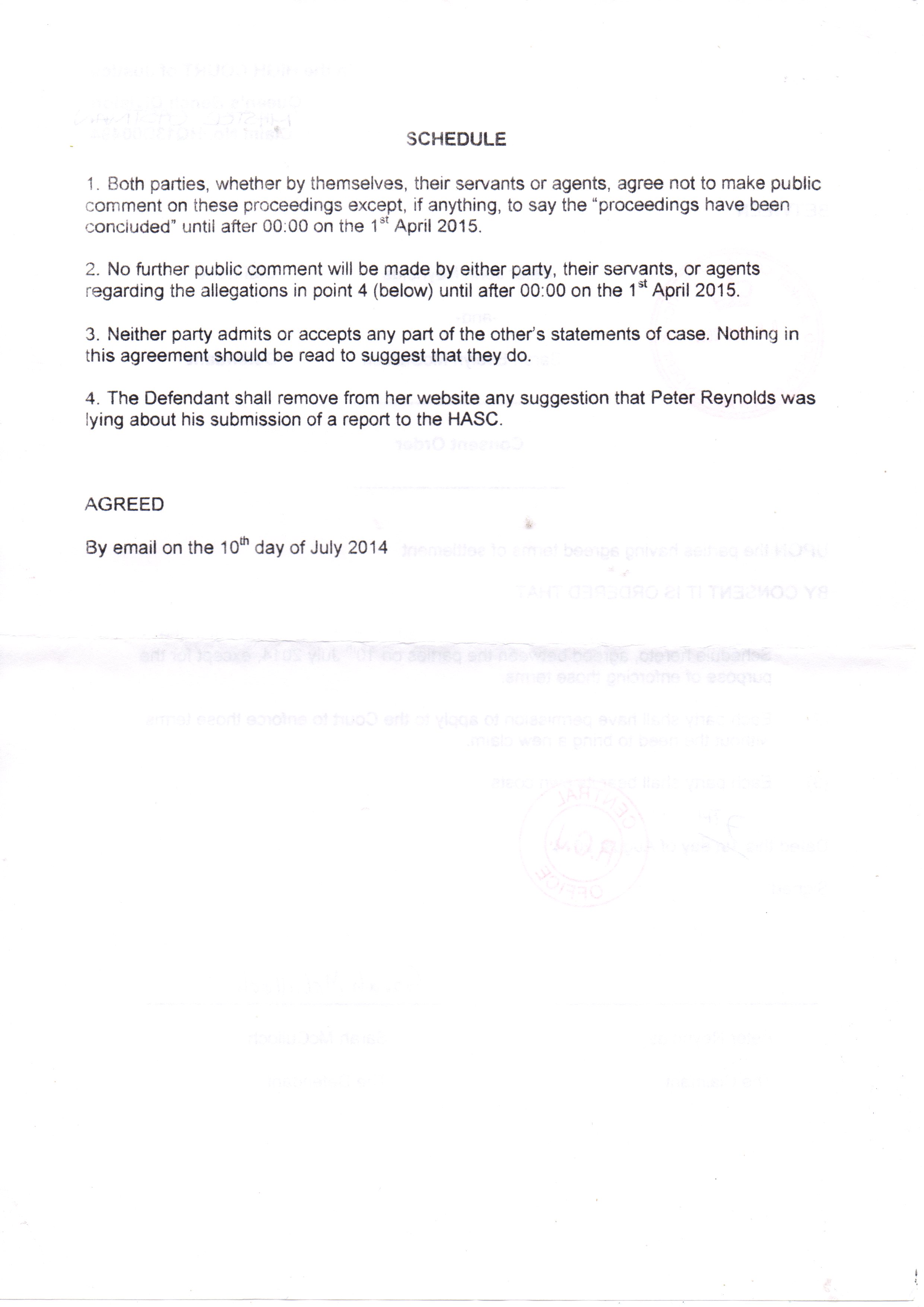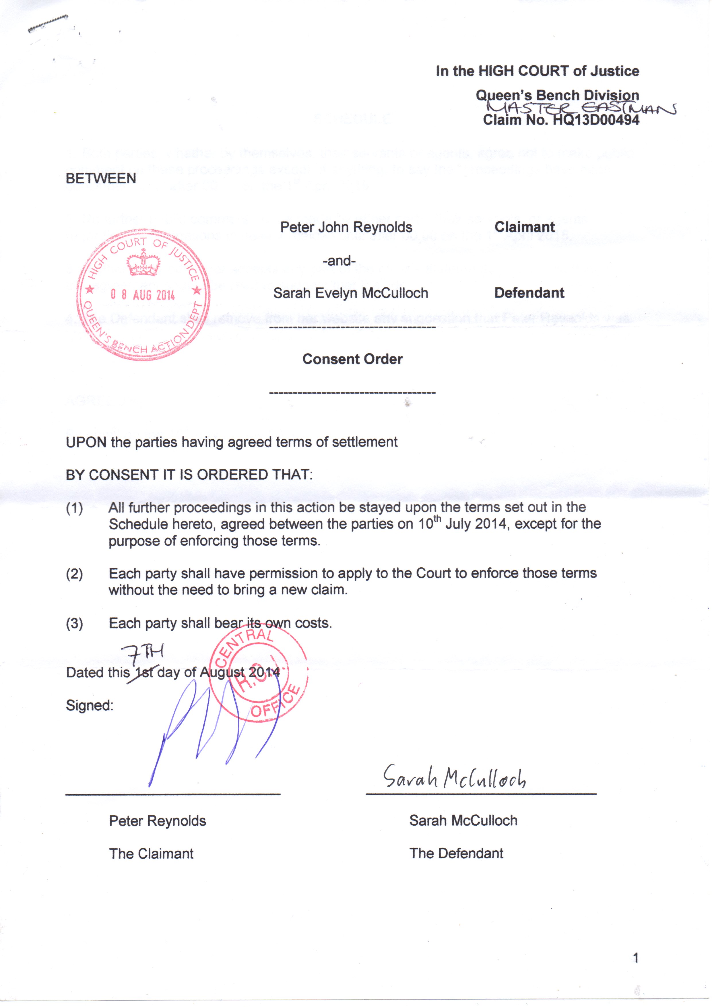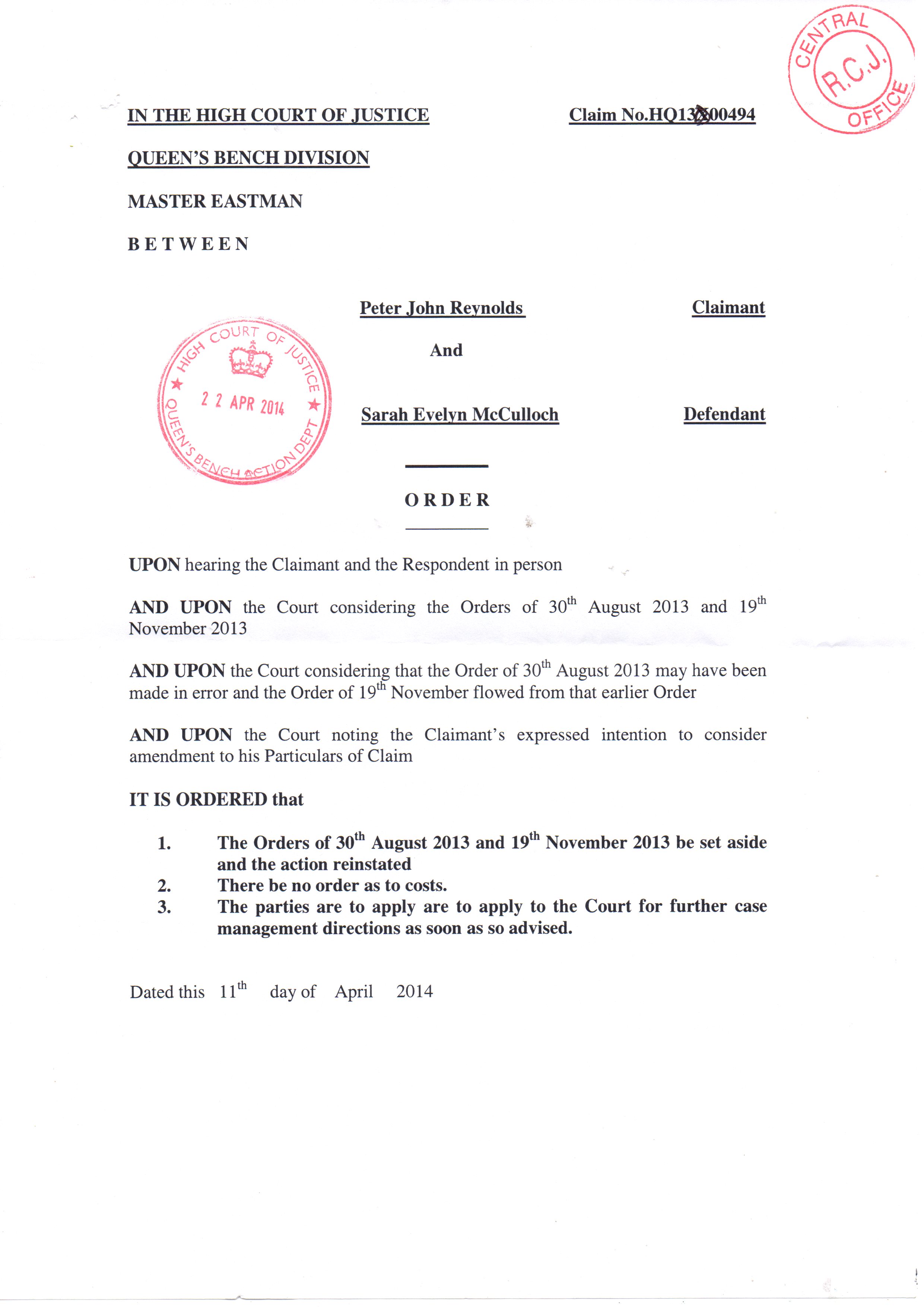 Confirming my report of 11th April 2014, I today received the sealed Order from the High Court setting aside the judgment that Sarah McCulloch had obtained and reinstating the action.