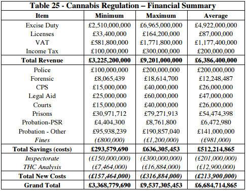 ‘Taxing the UK Cannabis Market’, 2011, Atha et al, projects a net annual gain to the UK economy of between £3.4 billion to £9.5 billion based on a £1 per gram cannabis sales tax in addition to VAT. See the attached table which neatly summarises this. I have also attached a full copy of the study.