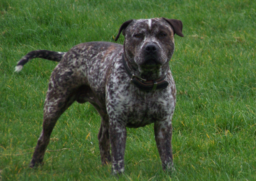 He’s a cross between a Staffordshire Bull Terrier and a German Shorthaired Pointer – which is where he gets his gorgeous coat from, a mottled mixture of grey, black, white and a few touches of orange. I believe that, apart from his siblings, he is unique and he attracts a great deal of attention. People say he looks like a leopard and several times I have been offered large sums of money for him.