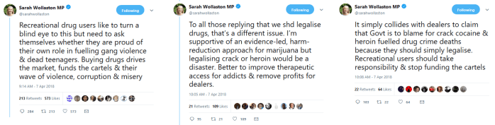 Dr Wollaston suggests that drug consumers are responsible for the violence and criminal activity around the drugs trade. I say this is utter nonsense. It is for the government to take responsibility!! That’s what you’re paid for. Take this market out of criminal hands and PROTECT people. It is disgusting to blame consumers for the harms of the drugs market which are caused by government. How dare you blame consumers for the harms of the criminal drugs market which irresponsible governments have created! UK drugs policy MAXIMISES all health and social harms. We are plagued by ignorant, stubborn, anti-evidence fools in government who are killing our children.