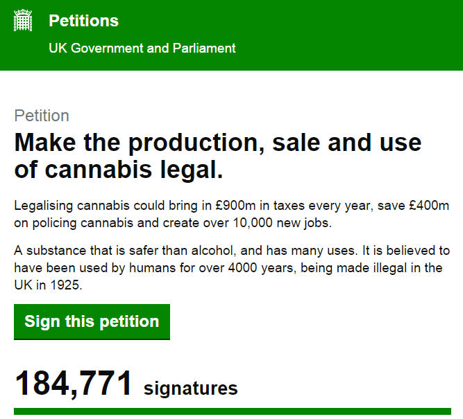 Nearly 200,000 people have signed a petition to legalise cannabis. It’s not just a simple click of a mouse button, it requires email verification. It is an enormous event. It is only the tip of the iceberg of the millions in the UK that want to see our archaic and harmful laws on cannabis changed.