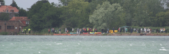 High summer. A blanket of thick grey cloud and a force four or five south-easterly blasts a fine drizzle into my face. We’re checking out the aftermath of yesterday’s invasion and the pleasant surprise is that there’s no evidence at all of the drama that was played out near the Langstone bridge.